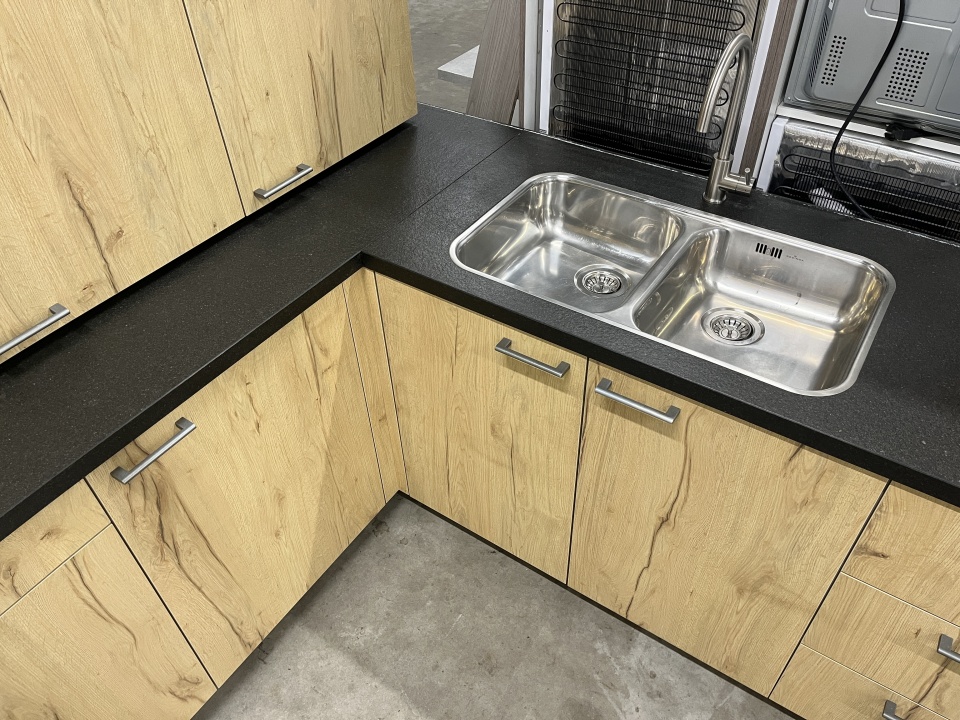 een hardstenen werkblad, een dubbele spoelbak,