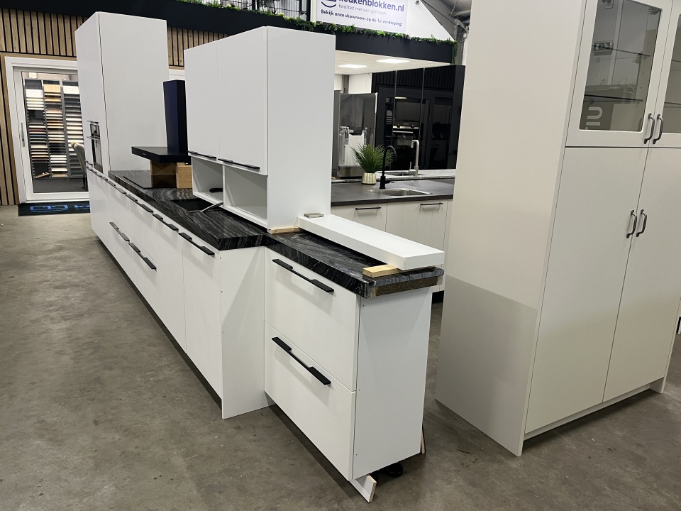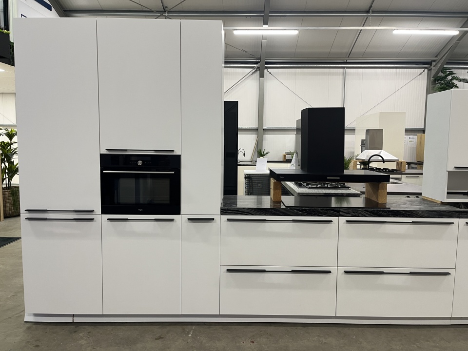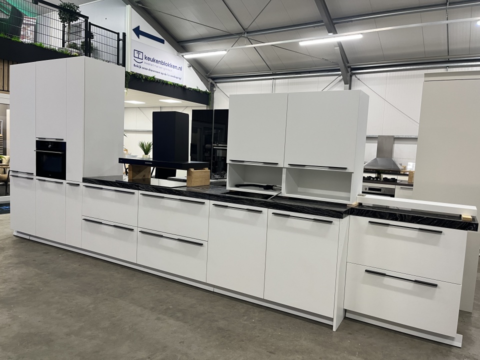 De kleur van deze keuken is wit mat.